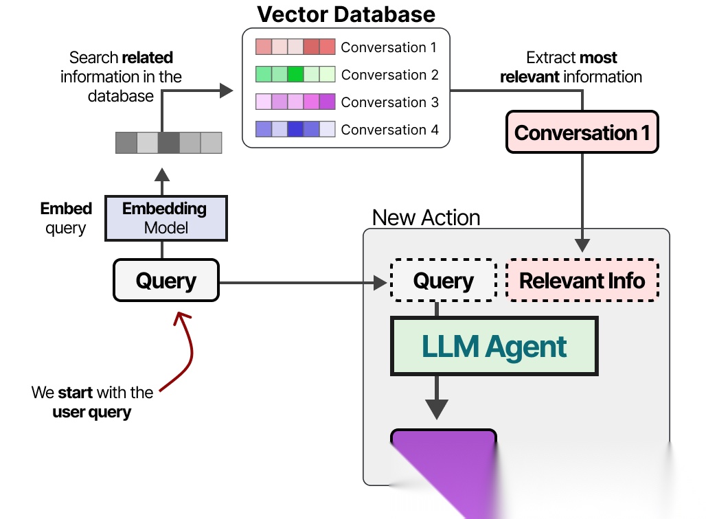 实现长期记忆的常见技术是将所有先前的交互、行动和对话存储在外部向量数据库中。
