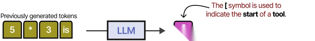 它通过使用[and] token来指示调用工具的开始和结束。当给定一个提示,例如"5乘以3等于多少?",它开始生成 token 直到达到 [ token。