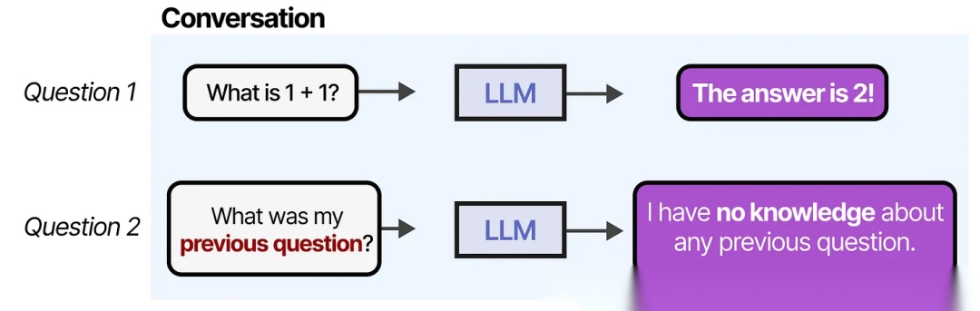 例如,当你向LLM提出一个问题,然后重开一个对话,询问另一个问题时,它不会记得之前的问题。