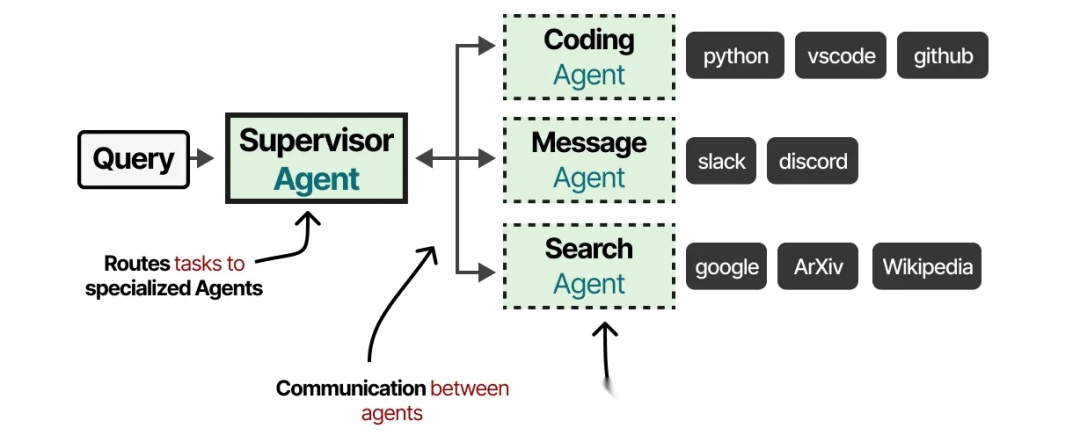 这些多智能体系统通常由专门的智能体组成,每个智能体拥有自己的工具集,并由一个主管(Supervisor)来进行管理。主管负责协调智能体之间的通信,并将特定任务分配给专业化的智能体。