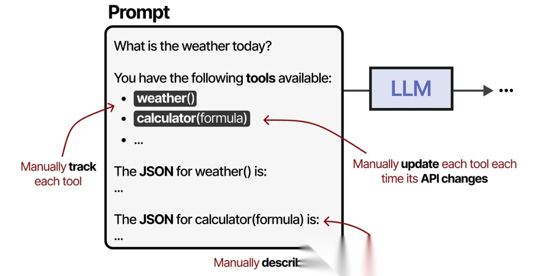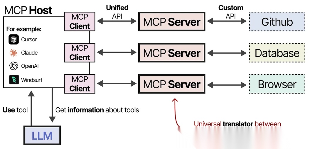 这个框架通过连接到任何 LLM 应用程序都可以使用的 MCP Servers,使创建工具变得更加简单。因此,当你创建一个与 Github 交互的 MCP Server时,任何支持 MCP 的LLM 应用程序都可以使用它。