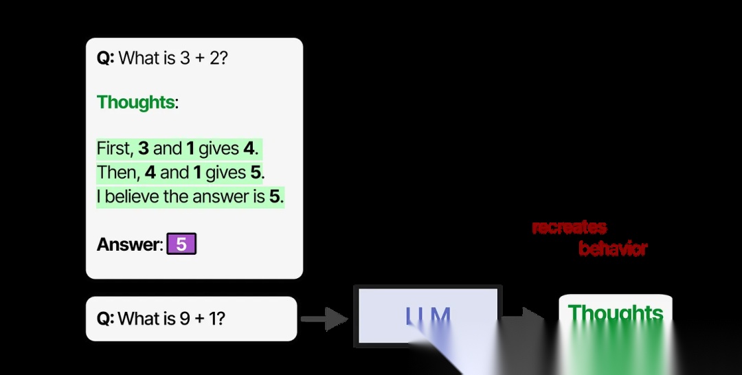 在训练 LLM 时,我们可以给它提供足够数量包含思考类示例的数据集,或者 LLM 可以发现自己的思考过程,比如使用强化学习。