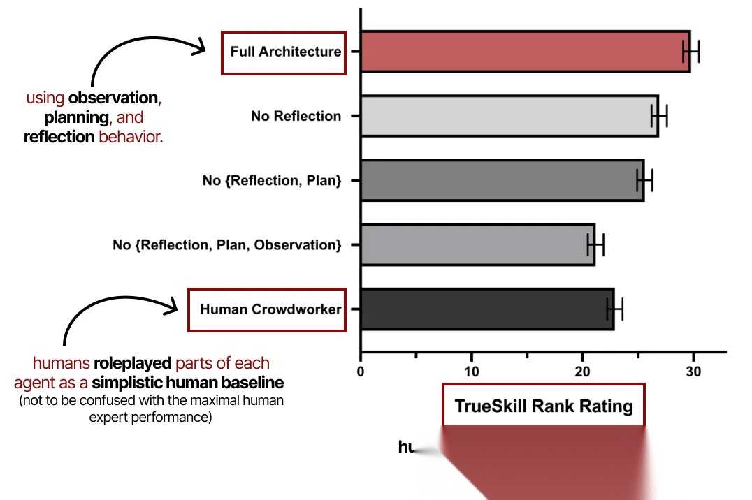 该评估展示了观察、规划与反思对于生成式智能体表现的重要性。正如之前所述,没有反思行为的规划是不完整的。