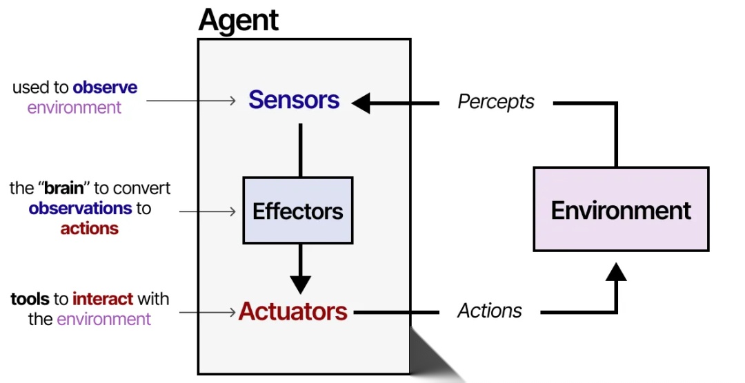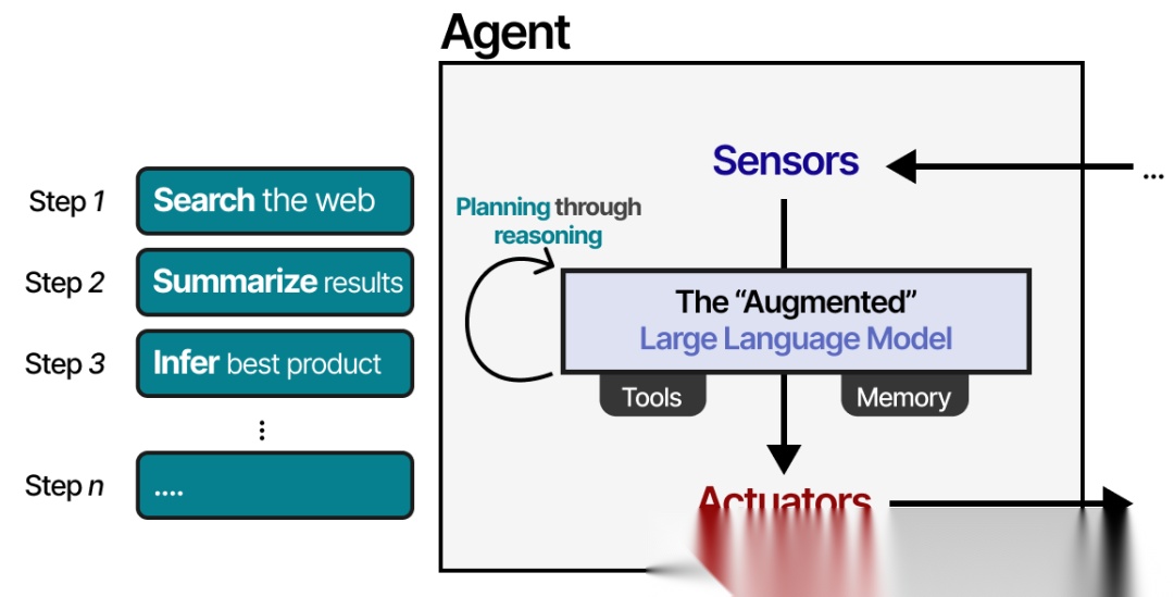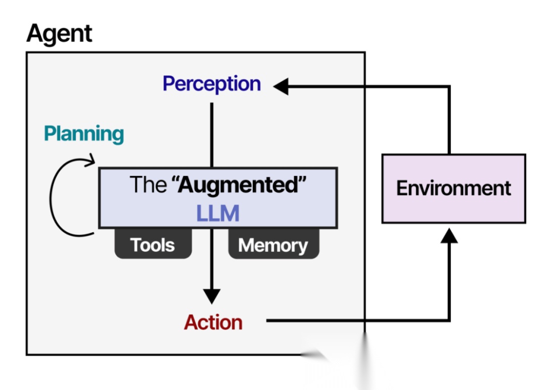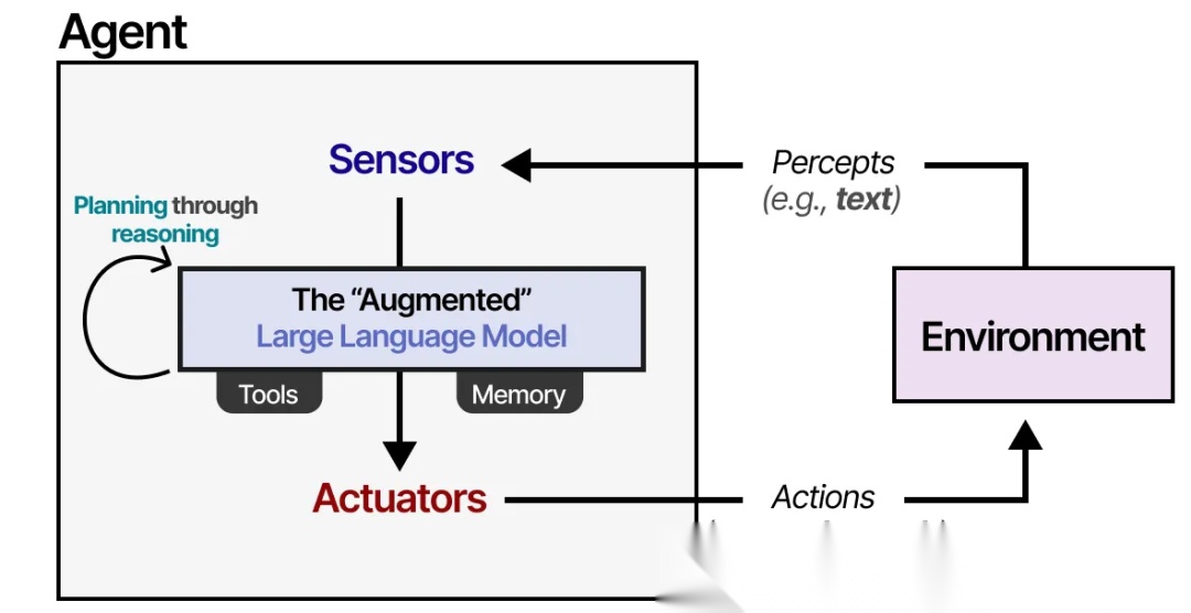 使用"增强型"LLM,Agent 可以通过文本输入观察环境(因为LLM通常是文本模型),并通过使用工具(如网络搜索)执行特定操作。