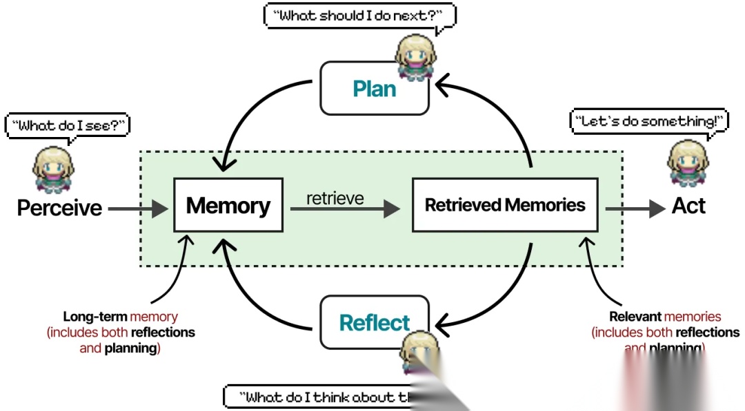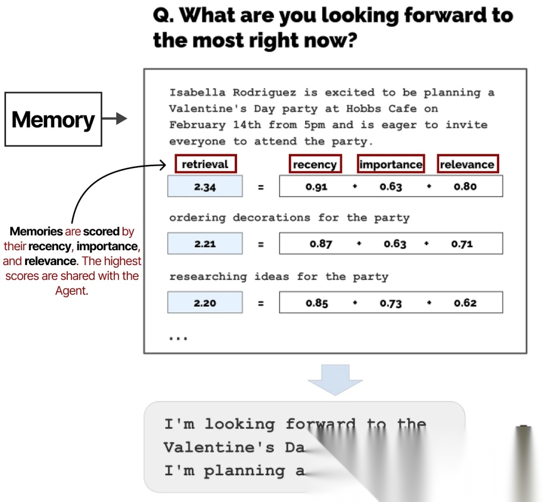 当智能体需要采取下一步行动或回答问题时,它会检索记忆,并根据记忆内容的时效性、重要性和相关性进行评分,将得分最高的记忆提供给智能体。