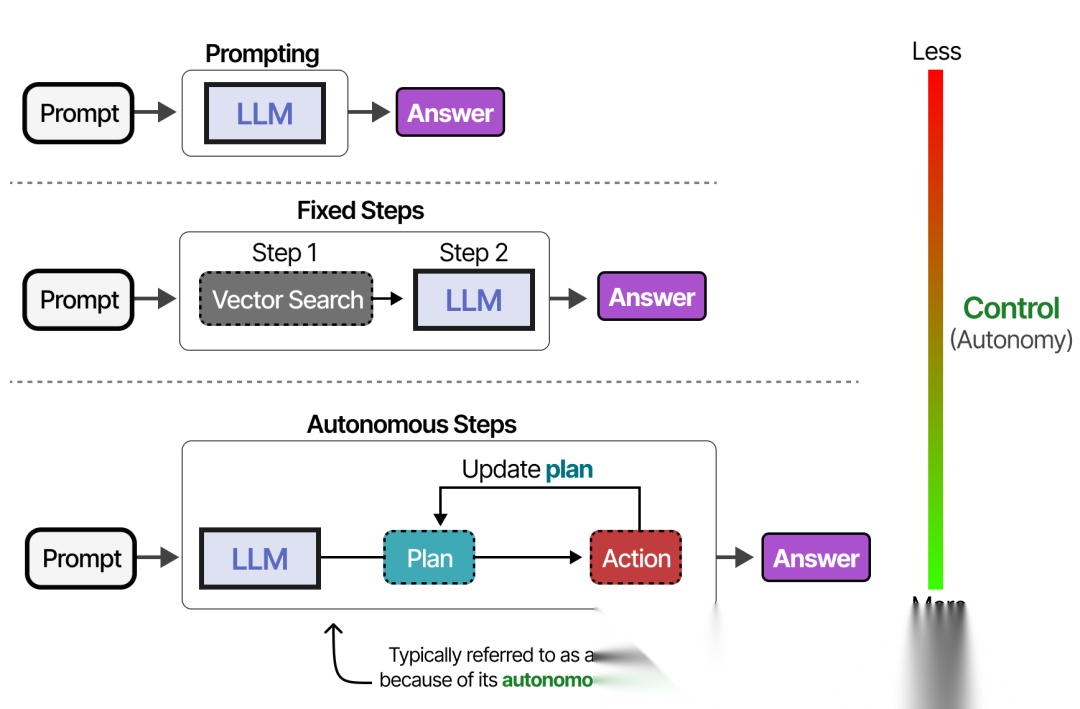 根据系统的不同,可以获得具有不同自主程度的LLM Agent。