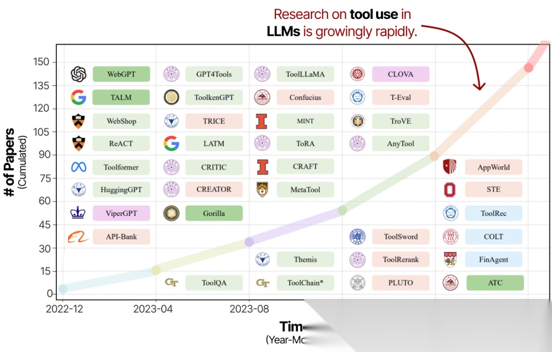 工具使用是增强LLM能力并弥补其不足的强大技术。因此,关于工具使用和学习的研究工作在过去几年中迅速增加。