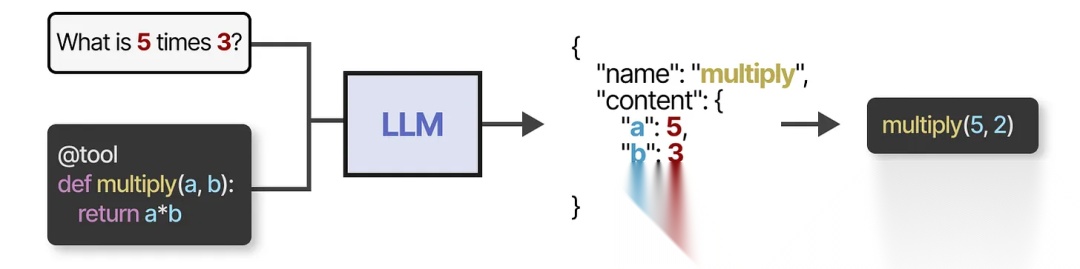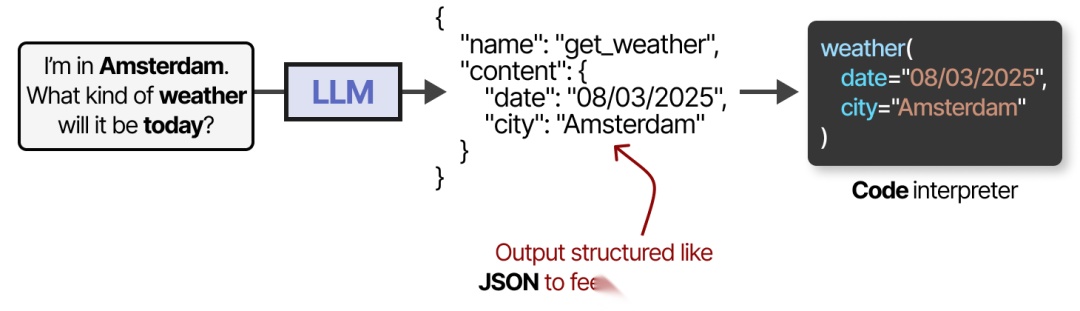 要实际使用工具,LLM 必须生成符合给定工具 API 的文本。我们通常期望生成可以格式化为 JSON 的字符串,以便它能够轻松地输到代码解释器中。
