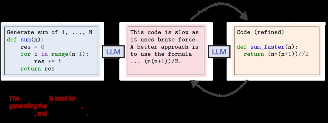 同一个LLM负责生成初始输出、精炼后的输出和反馈。