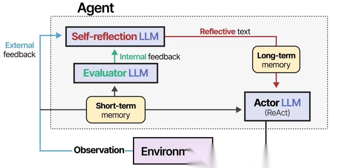 - • 自我反思(Self-reflection) — 反思执行者采取的行动和评估者生成的评分。