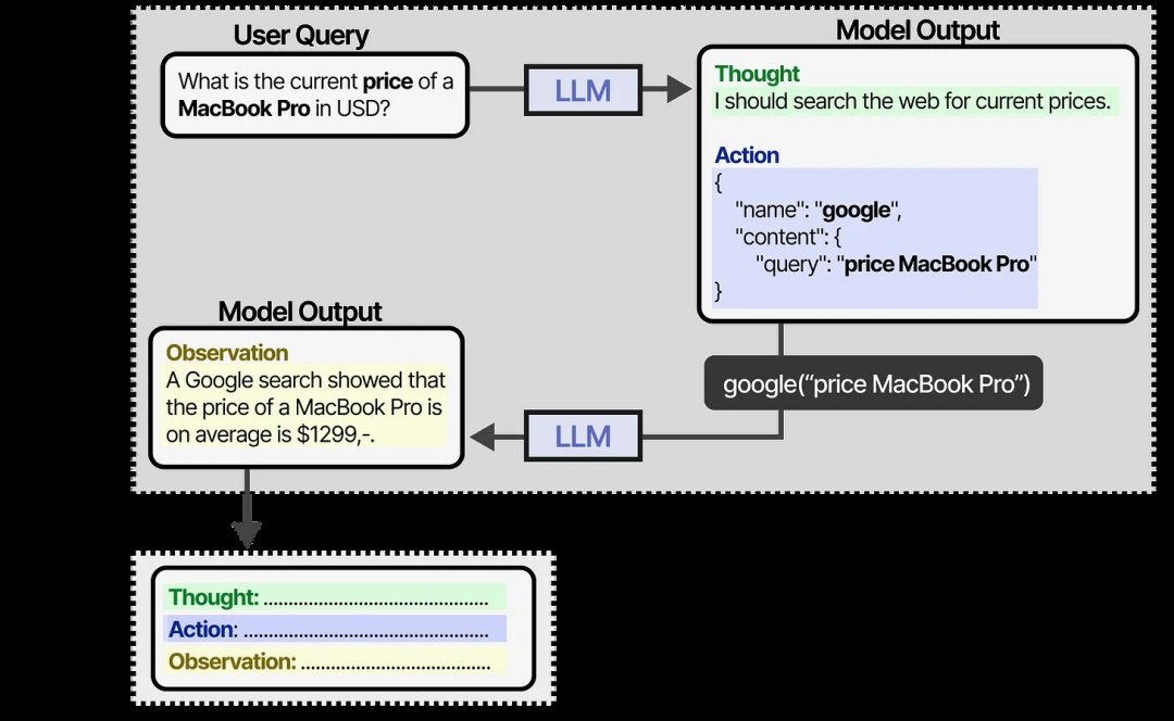 它会一直保持这种行为,直到某个行动指示返回结果。通过对思考和观察的迭代,LLM 可以规划行动,观察其输出,并相应地进行调整。
