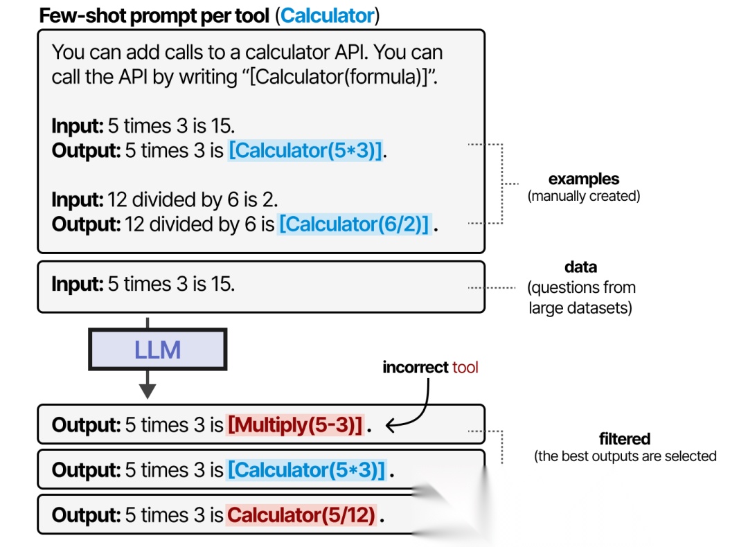 Toolformer通过生成包含大量工具使用示例的数据集来训练模型。对于每种工具,人工创建的 few-shot 提示会引导模型生成相应的使用示例。