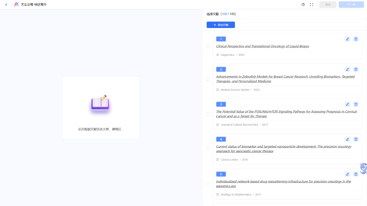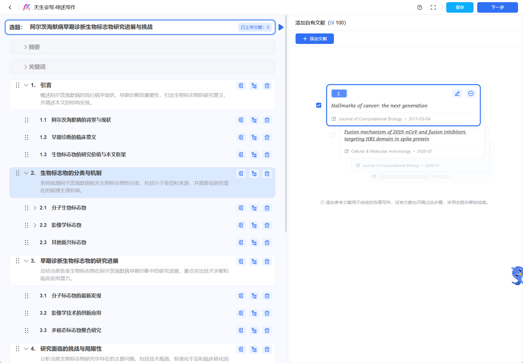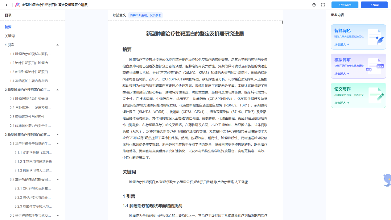 1. 智能选题与大纲:你只需输入研究方向(比如“肿瘤免疫治疗耐药性”),AI不仅能推荐细分选题,还能直接生成一个结构清晰的综述大纲。