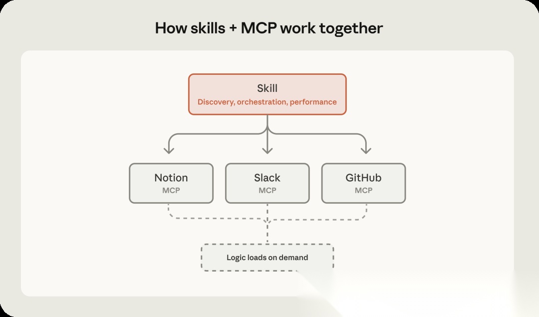 MCP是教模型怎么链接外部系统,api。skill是教模型怎么用工具,按什么流程处理,输出什么格式。