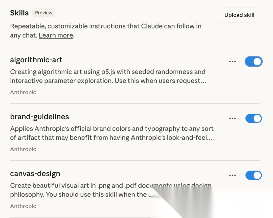 打开Code execution & file creation ,可以在skills下配置开启/关闭单个skill,还可以上传skill。
