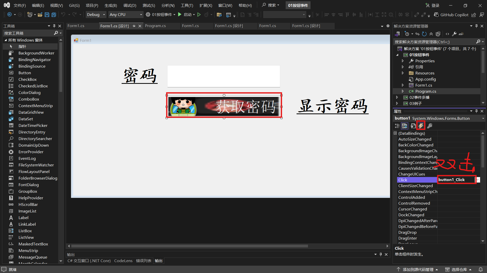 按钮的点击事件:1直接点击窗体上按钮 2按钮界面闪电标识符号找到对应事件名 点击生成一个事件