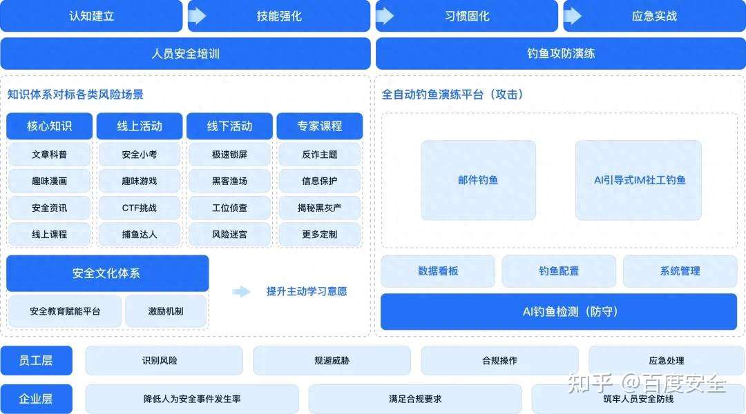 传统安全培训的 “一次性灌输”和“纸上谈兵” 已经应对不了复杂多变的安全威胁。百度安全深耕多年,融合实战经验与 AI 技术,构建起一套 “认知 - 实践 - 反馈 - 优化” 的全流程闭环的,让安全意识从 “被动接收” 转为 “主动践行”,真正实现知行合百度企业人员安全意识解决方案架构。