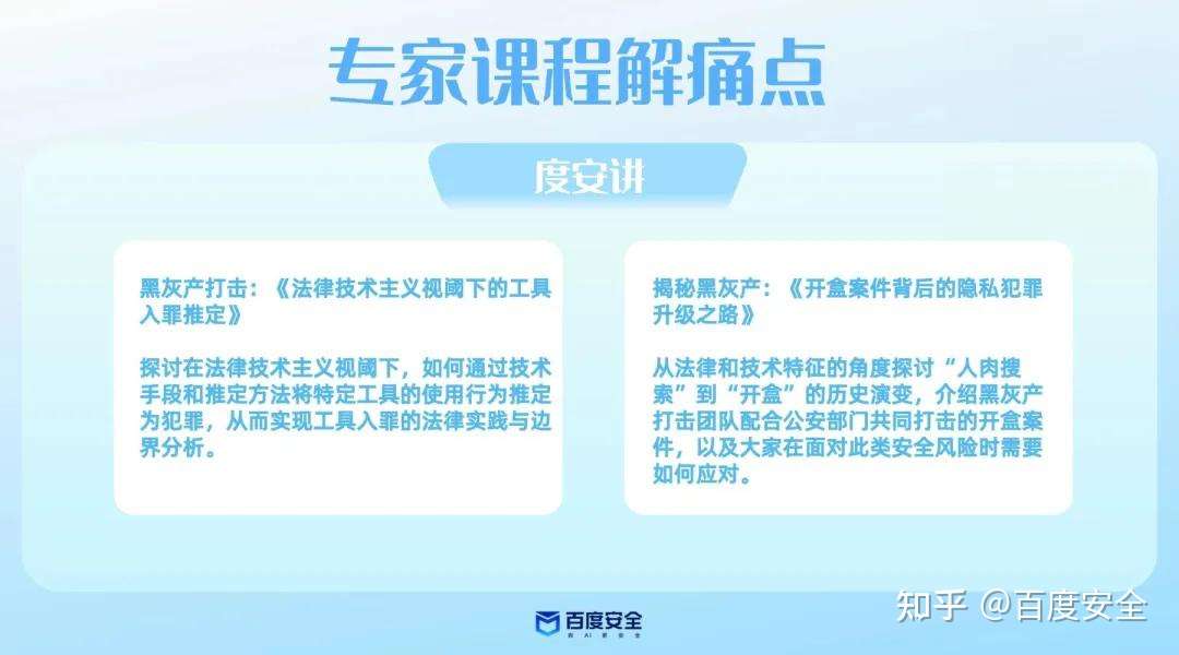 - 专家课程解痛点:紧扣《数据安全法》《个人信息保护法》合规要求,涵盖反诈防骗、信息保护、黑灰产揭秘等核心主题,更可针对不同行业特性定制专属方案,精准解决个性化安全诉求。