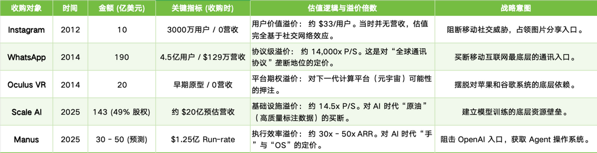 要理解 Manus 的定价,必须将其置于 Meta 过去二十年的并购长河中进行穿透式观察。