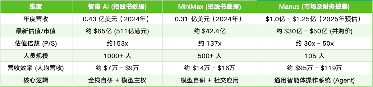 通过对比国内头部模型公司与 Manus 的核心财务数据,我们可以清晰地看到一种深刻的“估值逻辑错位”。