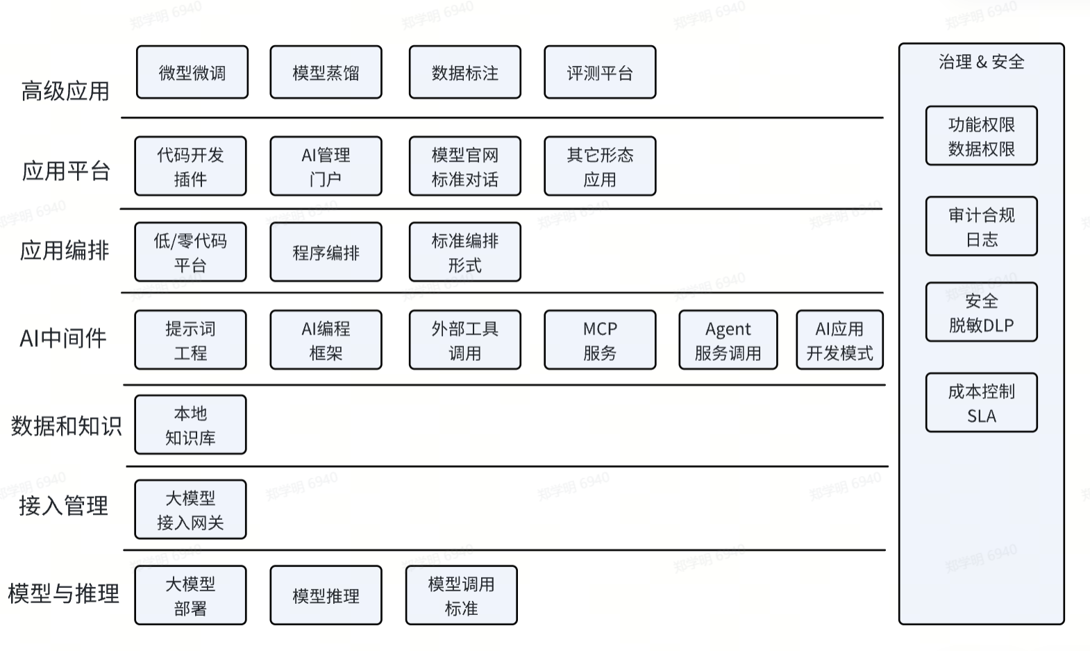 AI服务:为什么是AI平台,主要体现在这里,因为核心的服务是大模型服务,当然还会有用做匹配的嵌入服务,重排模型,代码补全服务,文件解析的服务(文件解析包括OCR,语音转文字,文字转语音之类),注意嵌入服务,重排模型主要用于RAG知识库,属于当前必须。