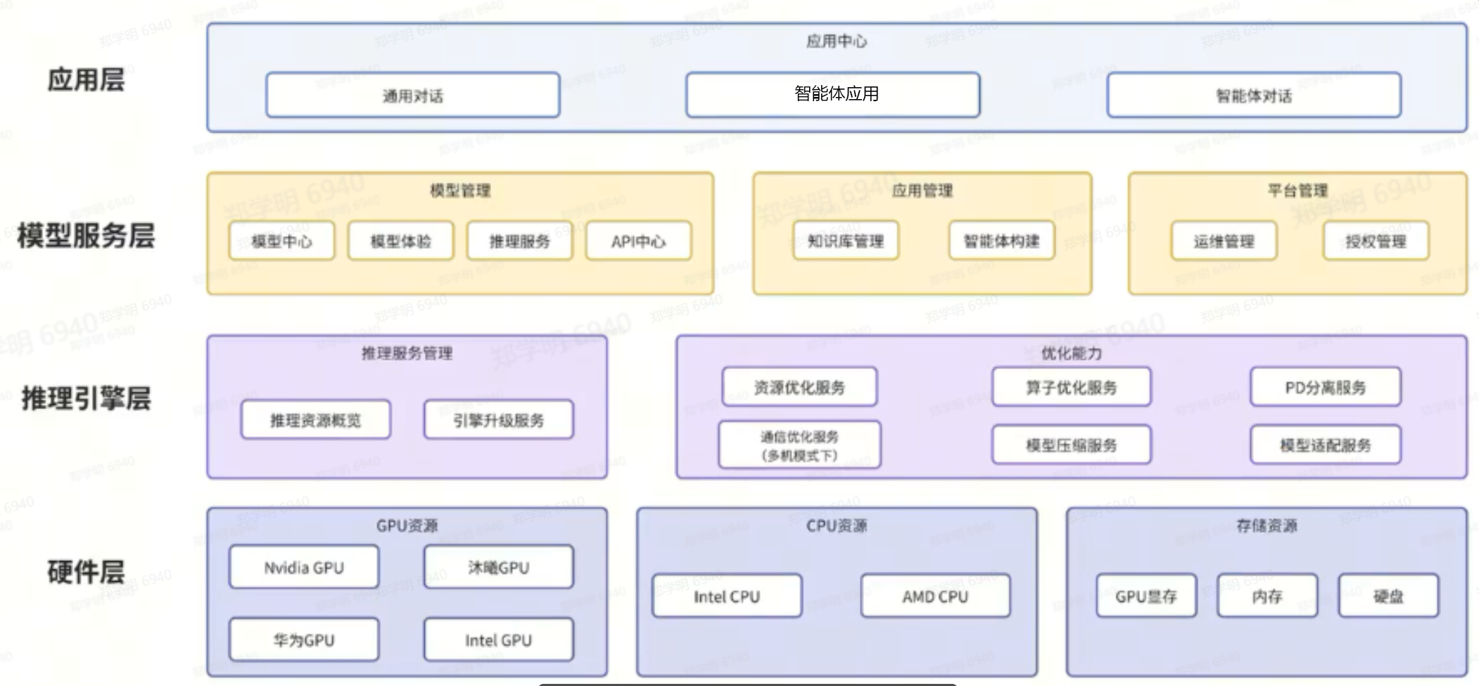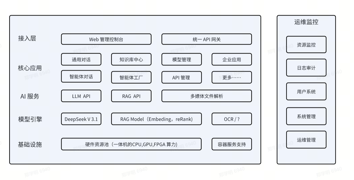 一堆智能体应用,基于模型的管理 ,平台管理。对于模型具体的引擎和硬件可直接使用公网,当然,有条件,有必要可以本地搭建(属于可选项)。
