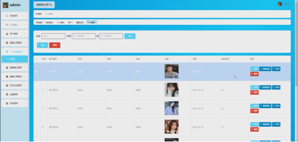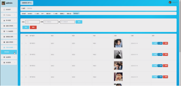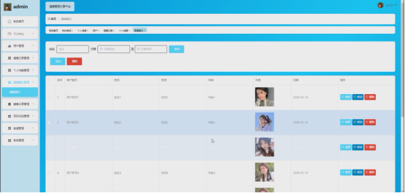 管理员点击个人档案管理。在个人档案页面输入姓名或日期进行查询、添加或删除个人档案信息列表,并根据需要对个人档案详细信息进行查看、健康建议、修改或删除操作;如图5-10所示: