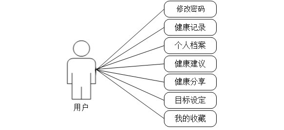 (3)用户可以实现对修改密码、健康记录、个人档案、健康建议、健康分享、目标设定、我的收藏等信息进行操作,用例分析如图3-3所示。