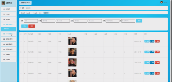 管理员进入主页面,主要功能包括对系统首页、个人中心、用户管理、健康记录管理、个人档案管理、健康建议管理、健康分享管理、目标设定管理、食谱管理、系统管理等进行操作。管理员主页面如图5-7所示: