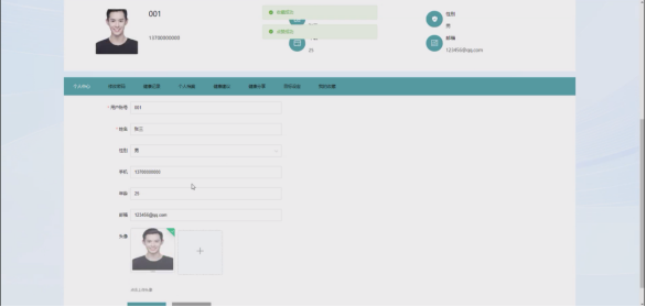 在个人中心页面输入个人信息可以进行更新操作,并在修改密码、健康记录、个人档案、健康建议、健康分享、目标设定、我的收藏页面进行详细操作;如图5-5所示: