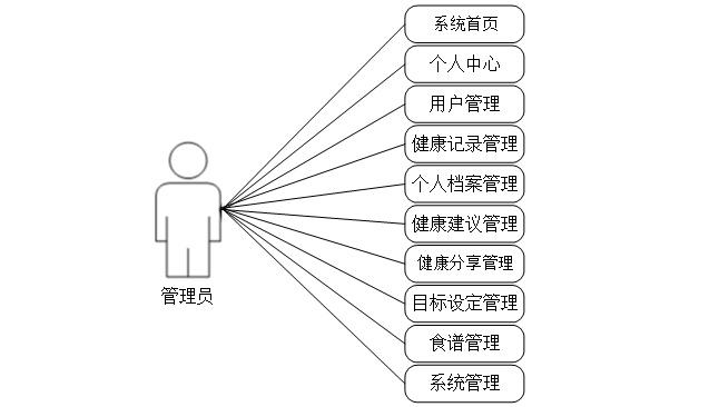 (2)管理员可以对系统首页、个人中心、用户管理、健康记录管理、个人档案管理、健康建议管理、健康分享管理、目标设定管理、食谱管理、系统管理等进行基本的信息管理。其用例分析如图3-2所示。