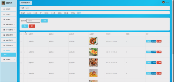 管理员点击食谱管理。在食谱页面输入食谱名称进行查询、添加或删除食谱信息列表,并根据需要对食谱详细信息进行查看、修改或删除操作;如图5-14所示: