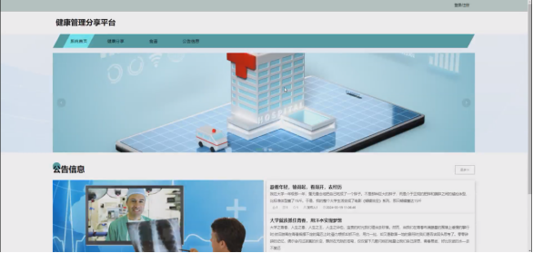 当人们打开系统的网址后,首先看到的就是首页界面。在这里,人们能够看到健康管理分享平台的导航条等。系统首页界面如图5-1所示: