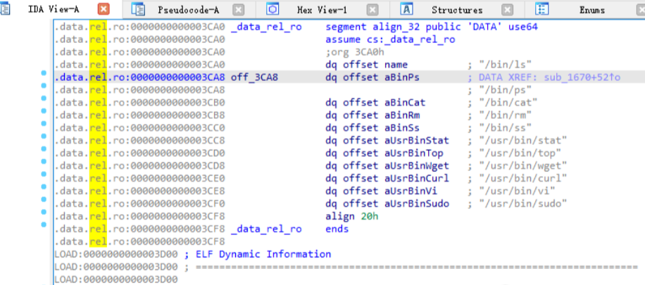其中的24行取出了off_3CA8(指定文件列表),给到V4,然后V5取出第一个,比如ls程序,然后递归循环进行感染双击off_3CA8,下图证明所有指定的感染文件: