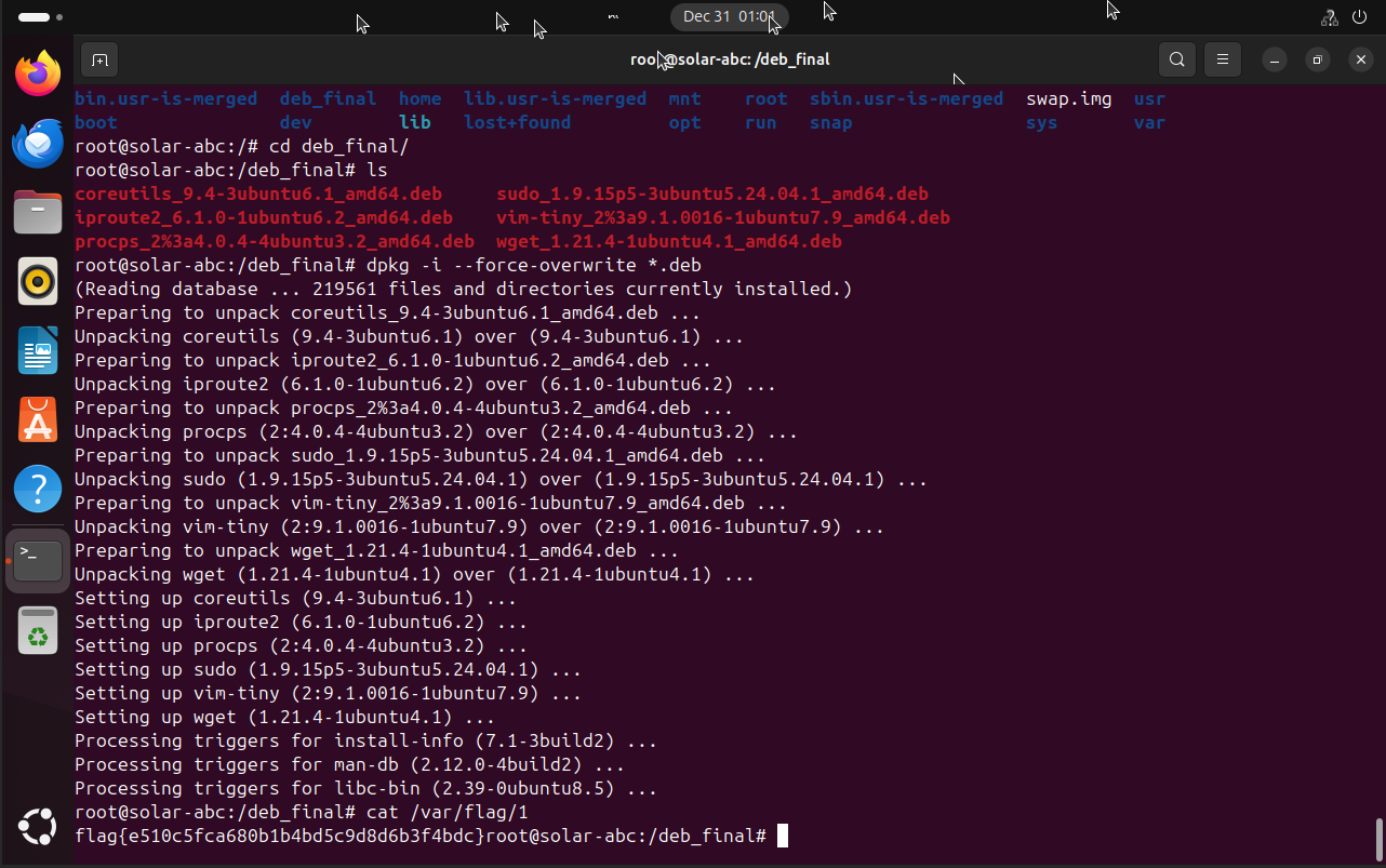 修复系统并恢复文件完整性:已知所有程序被感染,当前系统属于断网状态,所以作者贴心的在/deb_final目录下存放了对应程序的deb包,请尝试恢复所有程序,恢复完毕后在/var/flag/1文件获取flag