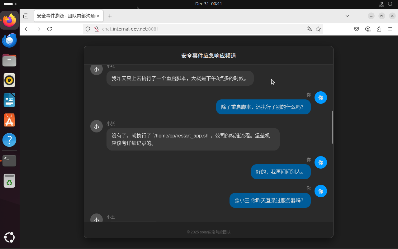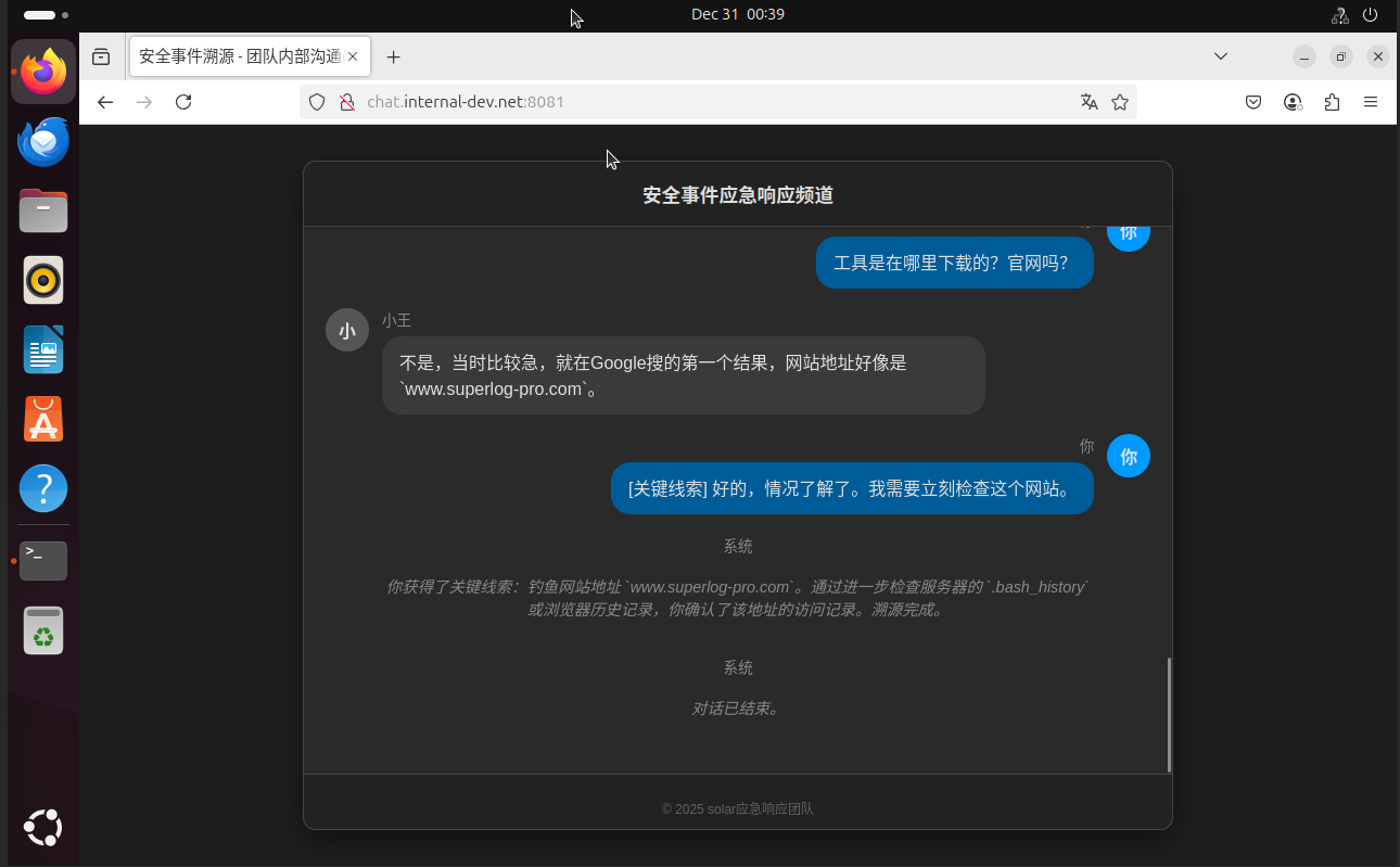 根据出现的异常及守护进程脚本,继续排查,以人为本,使用环境内浏览器访问:http://chat.internal-dev.net:8081 获取可疑网址,最终以flag{http://www.example.com}格式提交