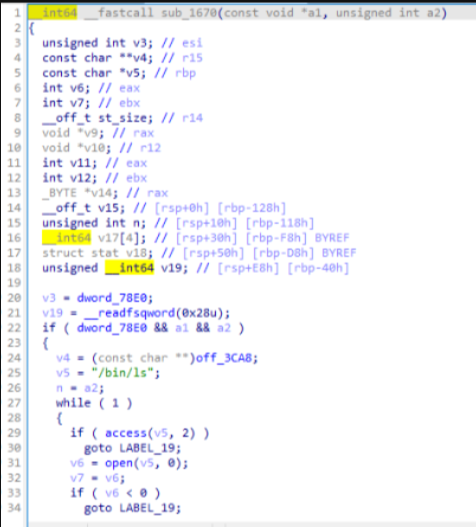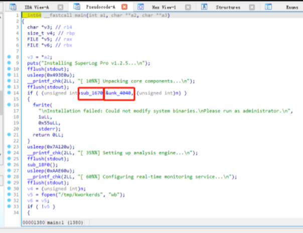 在第14行中 sub_1670为感染程序的函数,unk_4040为挖矿程序(kworkerds)
