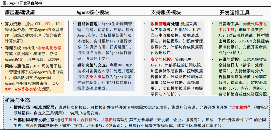 ① 基础设施类Agent:聚焦底层支撑,涵盖开发平台、多代理协同、数据策管等多环节,为AI应用构建基础。
