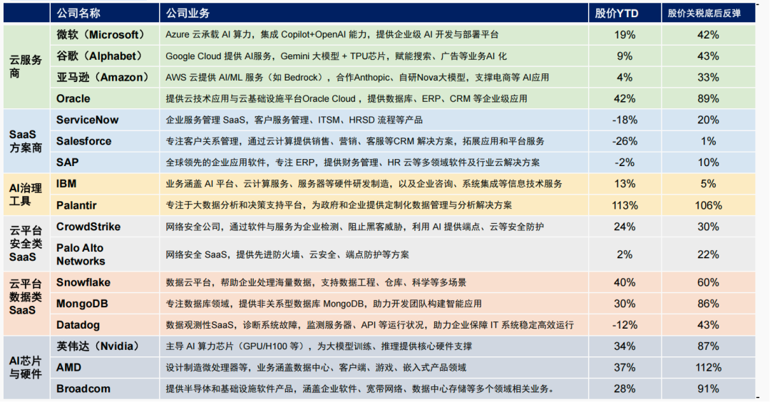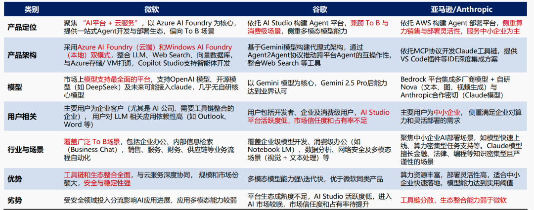 - 亚马逊/Anthropic依托AWS服务中小企业为主,侧重算力销售与便捷部署,Claude模型实用性强,但工具链分散。