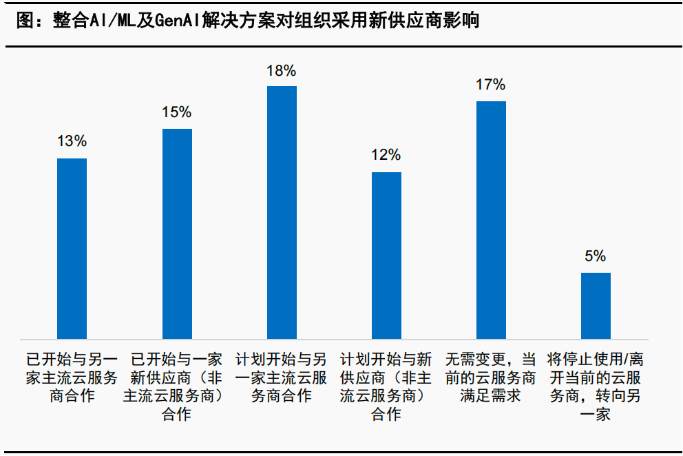 PaaS/应用平台供应商面临新的市场份额瓜分机会:根据IDC调查,将有70%的受访企业将更换或新增云/AI平台供应商。仅仅有17%的受访客户认为当前的云提供商可以满足他们的AI/ML/GenAI需求。28%的受访企业已经被迫更换提供商,而另有42%的受访企业计划离开当前的提供商或加入云提供商组合。
