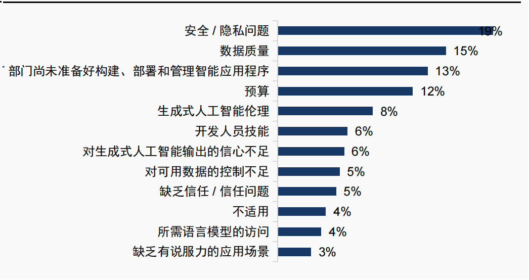 AI解决方案落地的主要阻碍:安全与隐私问题是影响企业AI项目落地最大的阻碍(19%),其次是数据质量(15%)和IT部门能力不足(13%)。另外预算、技术与伦理风险、输出结果可信度不足、数据使用控制不足也是重要挑战。