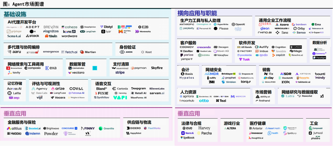 - 垂类市场:调查主要针对企业端,客户服务、软件开发为高潜力赛道,24年底调查显示,64家组织中2/3计划12个月内用AI代理支持客服。垂类AI Agent覆盖企业通用场景(人力、营销、安全运营等),较基础设施、垂直赛道商业落地更成熟。