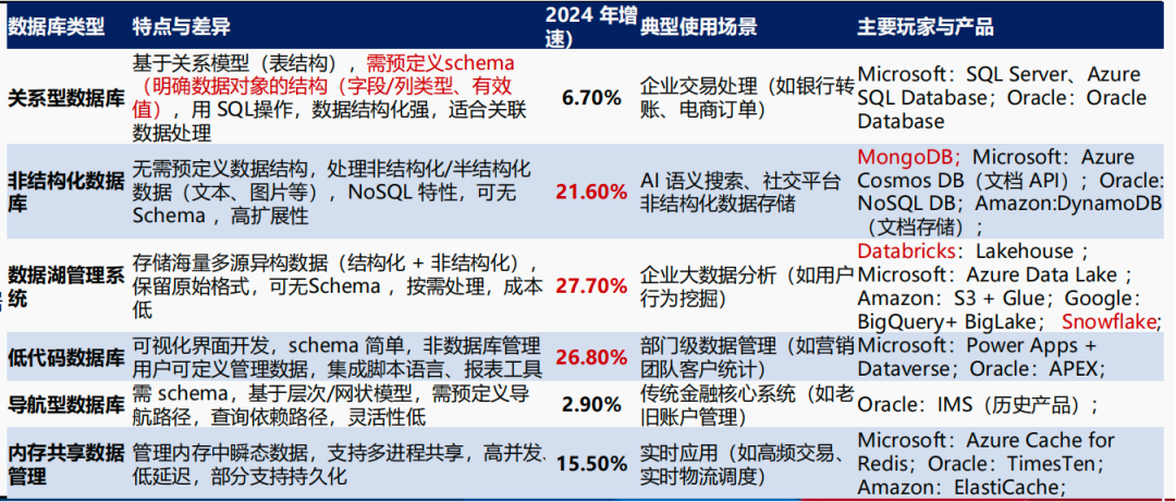 图:各类数据库特点、场景、主要玩家与2024年增速