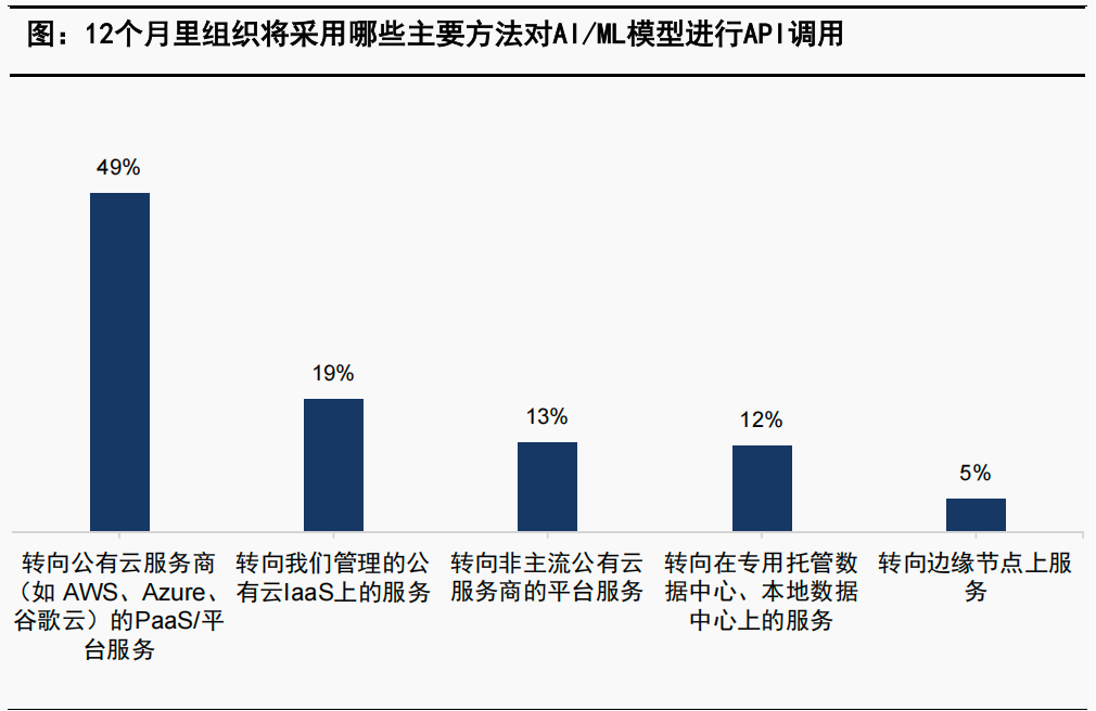 近一半的企业依赖公有云PaaS服务商进行AI方案落地:通过公有云实现对AI模型进行API调用,是企业部署AI应用的主要和关键方式。其他自建、本地托管或边缘节点上使用AI模型占比不到20%。