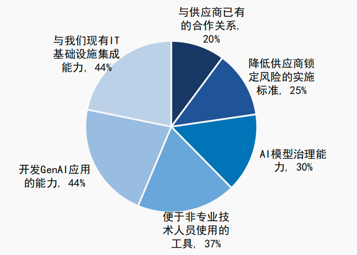 - 企业落地AI方案时,最关注“技术整合能力(44%)”和“应用开发能力(44%)”。企业想要快速落地专属 GenAI应用(如客服、营销),大模型应用是核心环节,同时为了避免AI孤岛,需打通现有系统(如ERP、CRM),让AI真正融入业务流程。