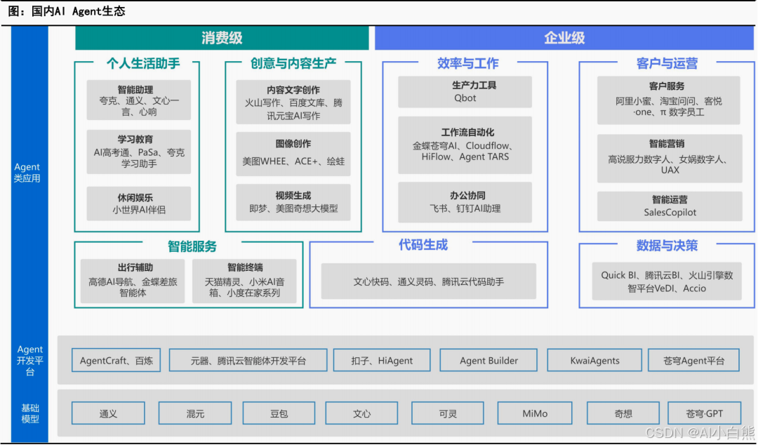 ③ 垂直应用类Agent :深耕金融、医疗等特定行业,贴合行业流程、法规与需求,深度融合专业知识,形成行业专属解决方案。