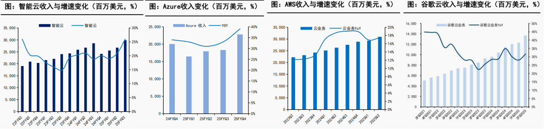 - 微软云: 云与Azure加速增长,本季度智能云收入为299亿美元,同比+26%,环比加速,其中Azure同比+39%,超业绩指引的34-35%。Azure年收入超过750亿美元,本季度未披露AI贡献Azure占比,上季度AI贡献Azure的16个点。尽管本季度新增数据中心容量,但需求仍高于供应,预26财年上半年仍有算力容量限制。