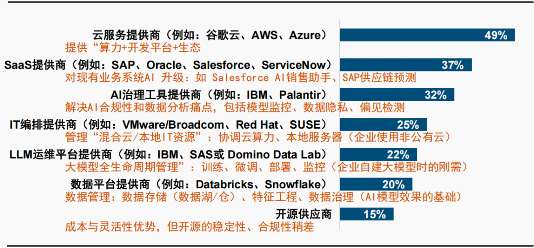 - 能帮助企业实现AI目标的供应商中云服务商(49%)碾压式领先,反映出AI应用依赖于AI平台,而AI平台=云算力+开发平台+生态的建设逻辑。