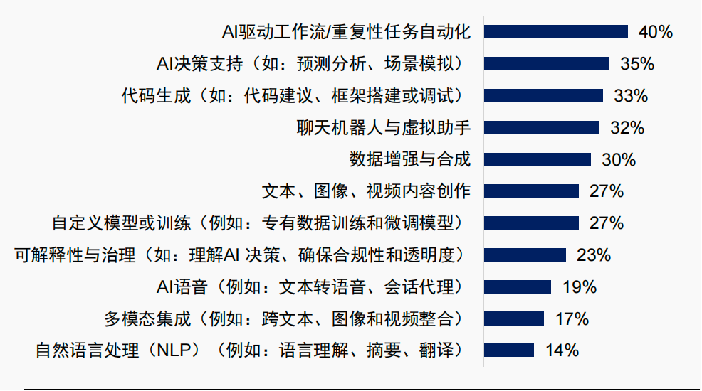 AI驱动的工作流自动化(如自动测试代码、模拟重复性任务)是首要需求。决策支持(如预测分析、场景模拟)、代码生成、聊天机器人/虚拟助手和数据增强合成的重要性也较高,超过30%客户会因此考虑平台的选择。