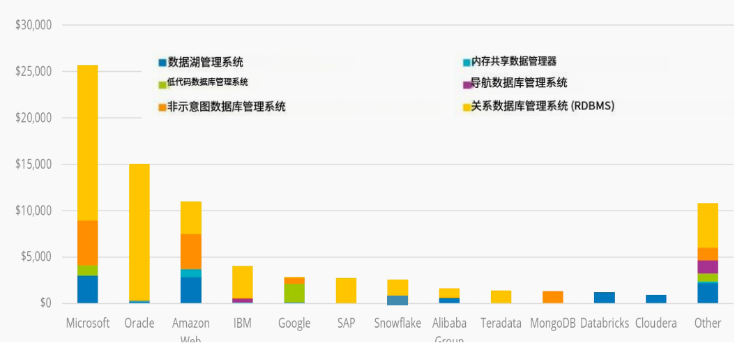 - Microsoft:以30%+的份额领跑(同比+13.4%),凭借SQL Server、Azure SQL、CosmosDB的AI集成提升性能与开发者效率。